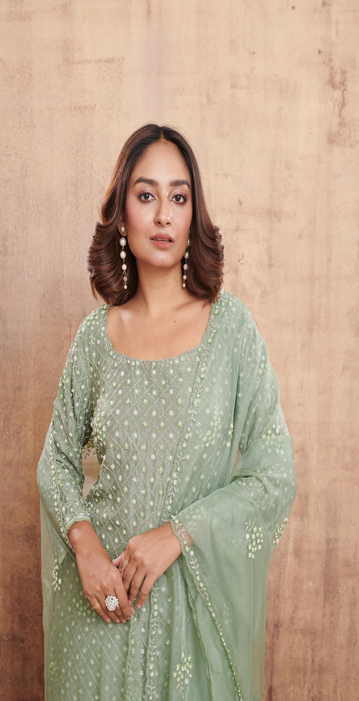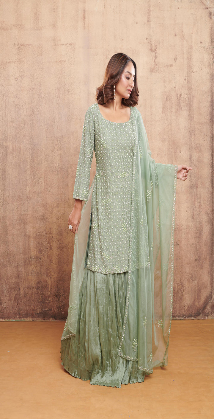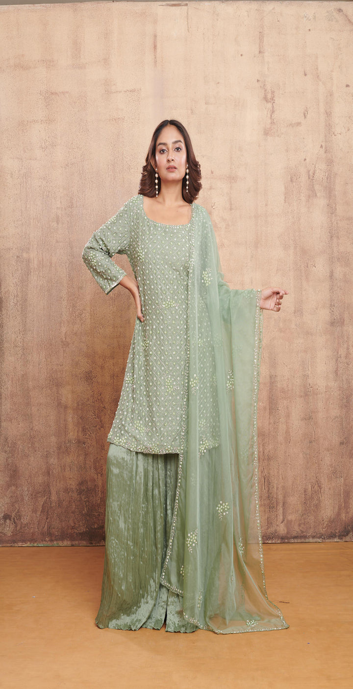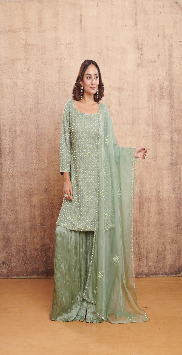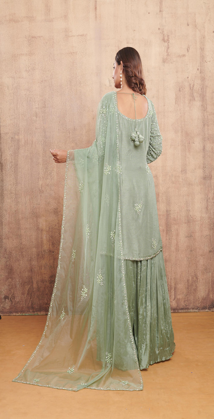 SAGE GREEN SILK HAND EMBROIDERED SHARARA SUIT SET #8295